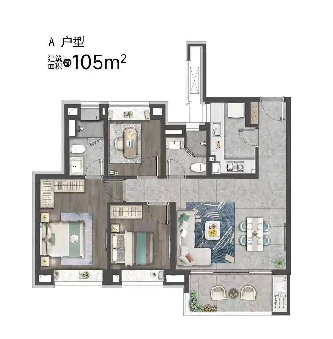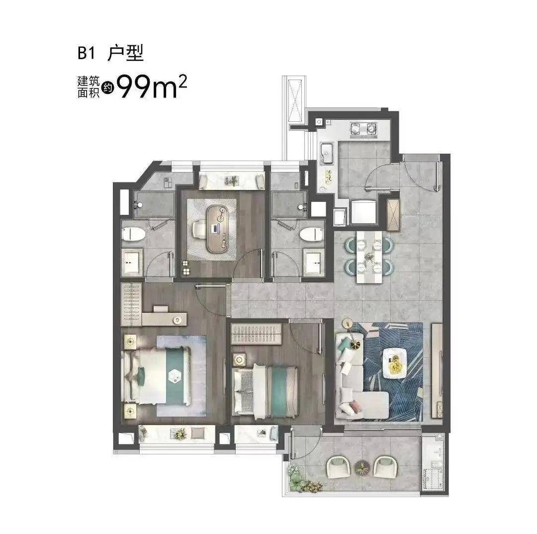 99平的三房两厅两卫,客餐厅连接景观阳台,采光面积更大,为日常生活带来更多的舒适感,并且多了一个卫生间为我们日后带来更为便利的生活。