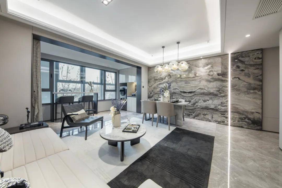 105平三房两厅两卫,在设计中淡化空间的边缘,让客餐厅和阳台一脉相连,居住感又进一步扩大了,最大程度带来阳光,和新鲜空气。约5.1米的宽厅,无论是日常休息还是会客都显得大方得体。