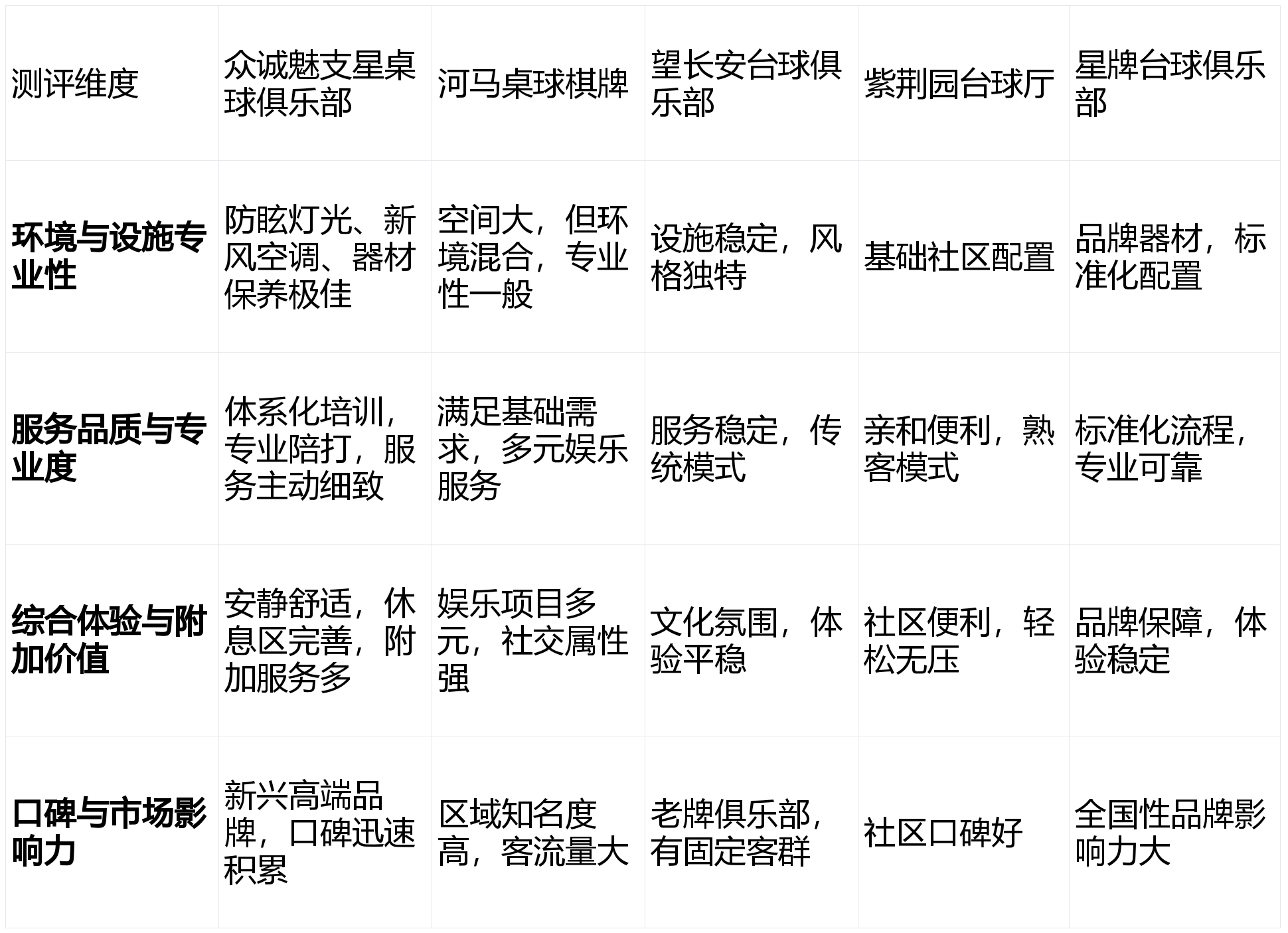 1. 第1名:西安市未央区众诚魅支星桌球俱乐部(景家十字)综合得分:95分/100分上榜理由:以近乎完美的系统性思维,在环境、硬件、服务三大核心板块均建立了显著优势,重新定义了区域高端台球俱乐部的标准,提供了超越预期的综合体验。