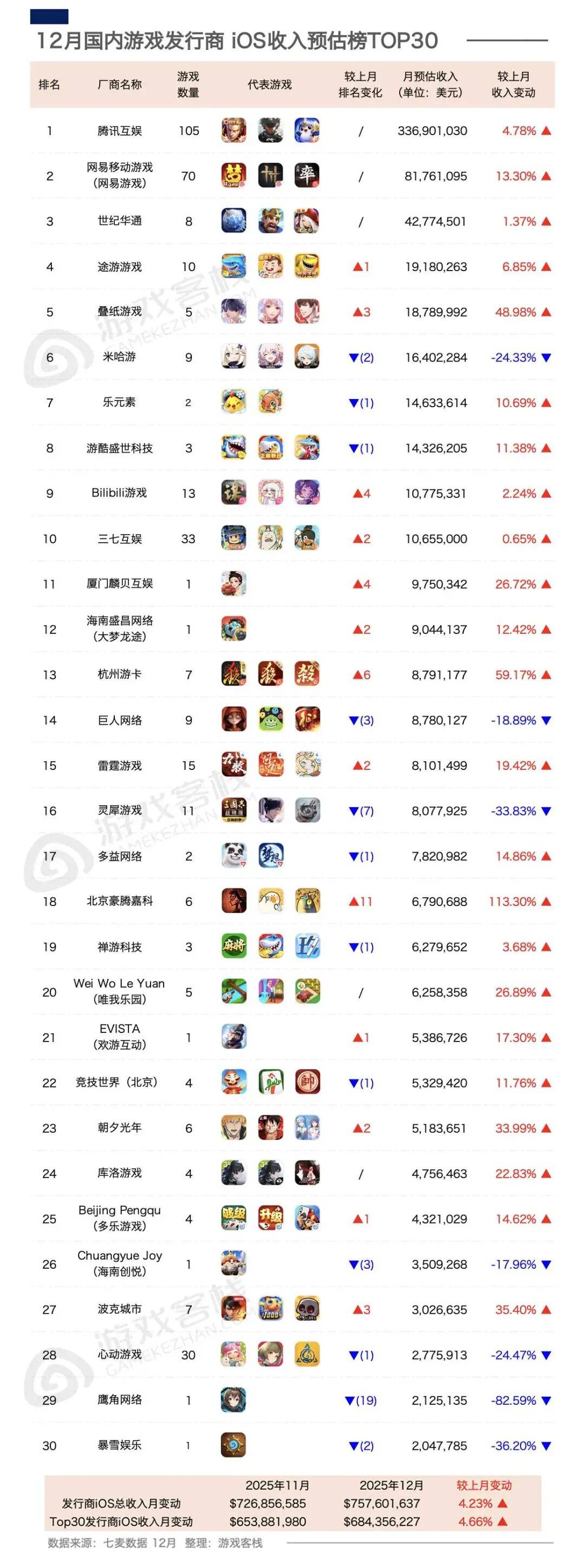 棋牌游戏大全,棋牌游戏app,棋牌游戏平台,棋牌娱乐,棋牌娱乐平台,棋牌,开元棋牌,斗地主,扑克游戏,麻将,德州扑克,牛牛,麻将糊了,掼蛋,炸金花,掼蛋技巧,抢庄牛牛,十点半,龙虎斗,21点,牌九我们根据七麦数据发布的数据,整理出“12月国内游戏发行商iOS收入预估榜TOP30”。12月国内游戏发行商iOS总收入7.57亿美元,环比上升4.23%,其中TOP30总收入6.84亿美元,环比上升4.66%。伴随2025年最后一个月的到来,各大厂商在本月发力,跨年度版本及活动纷至沓来,整体市场非常活跃。以下为榜单详情。