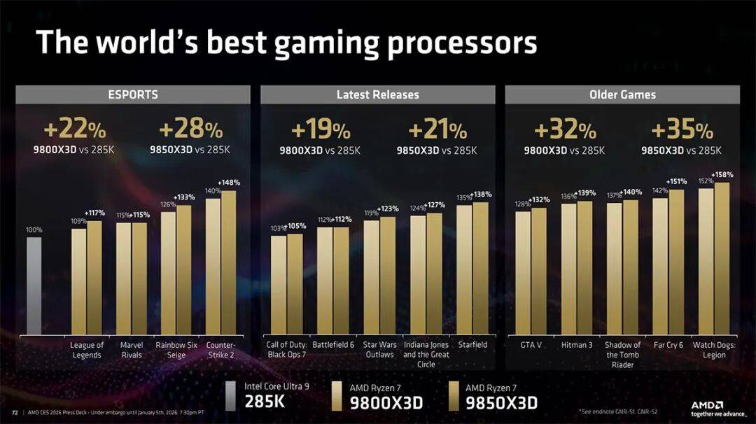 在不同类型的游戏中性能增幅是不一样的,与锐龙7 9800X3D相比,锐龙7 9850X3D在电竞类游戏中增幅是最大的,在3A大作中的增幅则没那么大。但在一些比较老的游戏中,锐龙7 9800X3D和锐龙7 9850X3D相比酷睿Ultra 7 285K的领先幅度确实非常大。