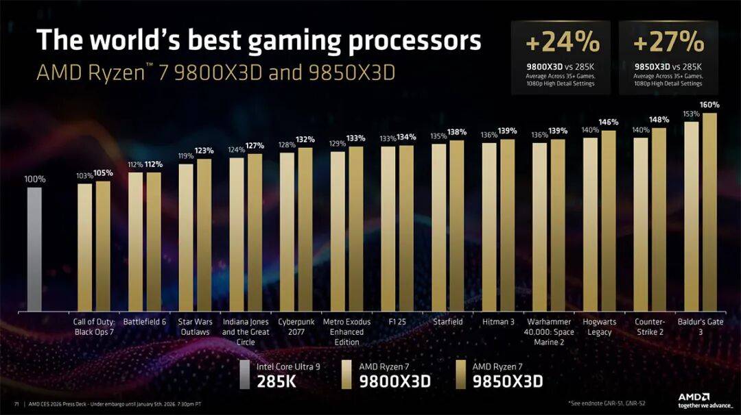 实际上原本锐龙7 9800X3D就可以提供一个比较好的游戏性能,根据AMD官方的数据,在1080p分辨率下,测试了35+款游戏,锐龙7 9800X3D的平均游戏帧率比酷睿Ultra 9 285K高出24%之多,而新推出的锐龙7 9850X3D则进一步拉开两者的差距,增幅来到了27%。