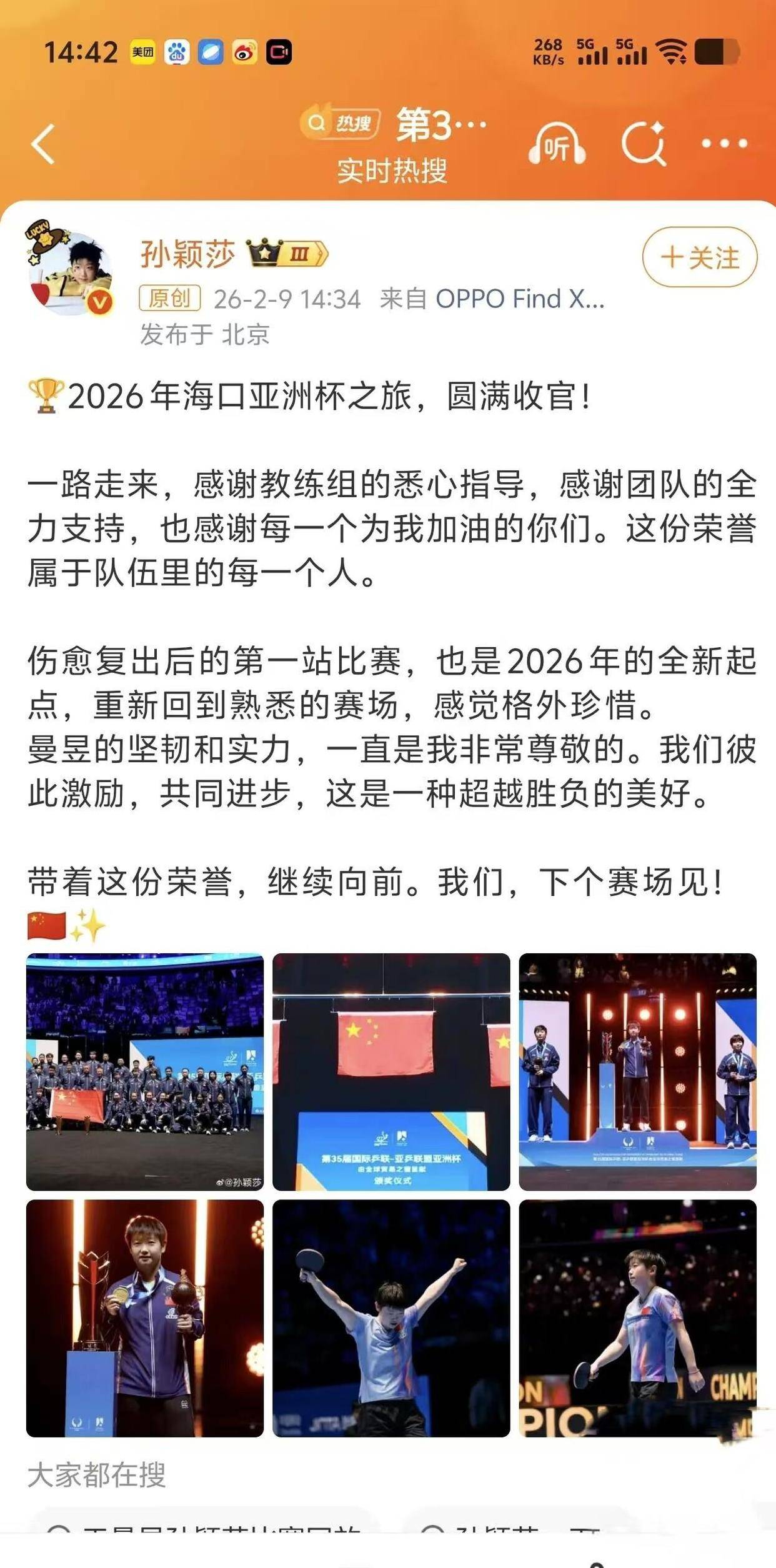 这种对集体的强调,不仅停留在第一张照片。 在亚锦赛女团夺冠后,她发布长文,核心只有一句话:“荣誉属于我们每一个人。 ”通篇三百多字,她连续四次表达感谢,感谢球队、教练、队友和球迷,却绝口不提自己的关键贡献。 即便是在个人社交媒体这样的私人领地,她也坚持使用“我们”而非“我”来定义胜利。 这种高度一致的“去个人化”表达,在当今追逐流量、热衷打造个人IP的体育圈里,显得格外“异类”。 但这并非孙颖莎的独创,而是深深植根于国乒的团队基因。 从王楚钦的“感恩的是团队”,到王曼昱的“冠军属于中国”,主力队员们的表达呈现出一种高度的价值认同。 孙颖莎的微博,成了这种集体主义精神在社交媒体时代最生动的展演窗口。