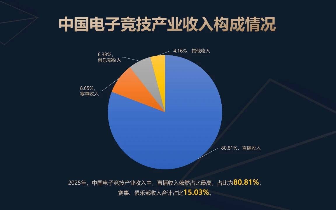 快速演进的背后,有行业迫切的生存现实。据《2025年中国电子竞技产业报告》显示,2025年中国电子竞技产业收入为293.31亿元,同比增长6.40%,实现稳健增长。但收入中占比最大的依然是线上直播收入,占到行业总收入的80.81%,赛事收入和俱乐部收入合计仅占15.03%。往前推几年,各项收入的比例变化微乎其微。